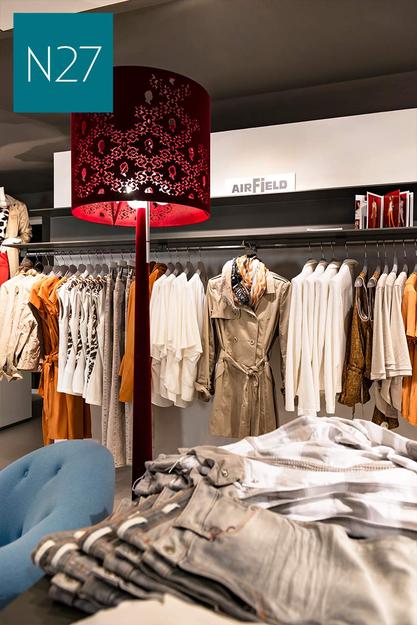 Das N27 hat im Bereich Contemporary auf zwei Etagen einiges zu bieten: Comma, More & More, MosMosh, Opus, Someday, Soyaconcept und YAYA, um nur einige Vertreter zu nennen. Sahnehäubchen wie Lieblingsstück, Marc Aurel und Rich&Royal runden das Sortiment ab. Auf zwei weiteren Etagen finden Sie eine geballte Hosenkompetenz von Angels, Brax, Mac und Raffaello Rossi. Abgerundet wird das Sortiment von Bianca, Frank Walder, Monari und Rabe. Spezialisten für Outdoor wie FuchsSchmitt, Gil Bret und Milestone stellen die Jackenkompetenz dar.