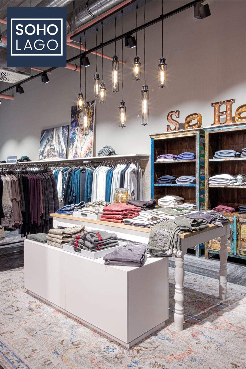 Mit dem SOHO LAGO im Lago Shopping Center in der Bodanstraße in Konstanz haben wir ein ganz neues Einkaufserlebnis geschaffen: modern, urban, sympathisch, unkompliziert. Die loftartige Einrichtung unseres Stores im LAGO Shopping-Center Konstanz spiegelt dieses Lebensgefühl wider. Die sorgfältig ausgewählten Marken unterstreichen den internationalen Charakter des Ladens. Vertreten sind Namen wie Buena Vista, Guess, Opus, Someday, MosMosh, Rich&Royal, SoyaConcept und YAYA. Das Herrensortiment wird geprägt von Hugo Boss, Destrezzed, Drykorn, Marco Polo, Alberto und Scotch&Soda.